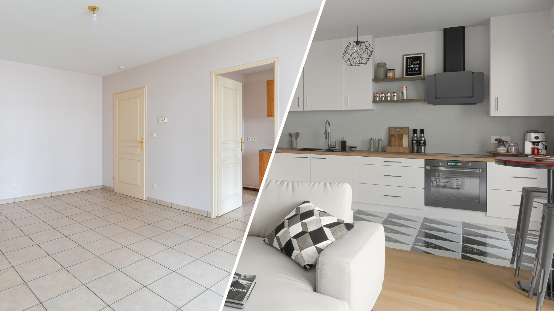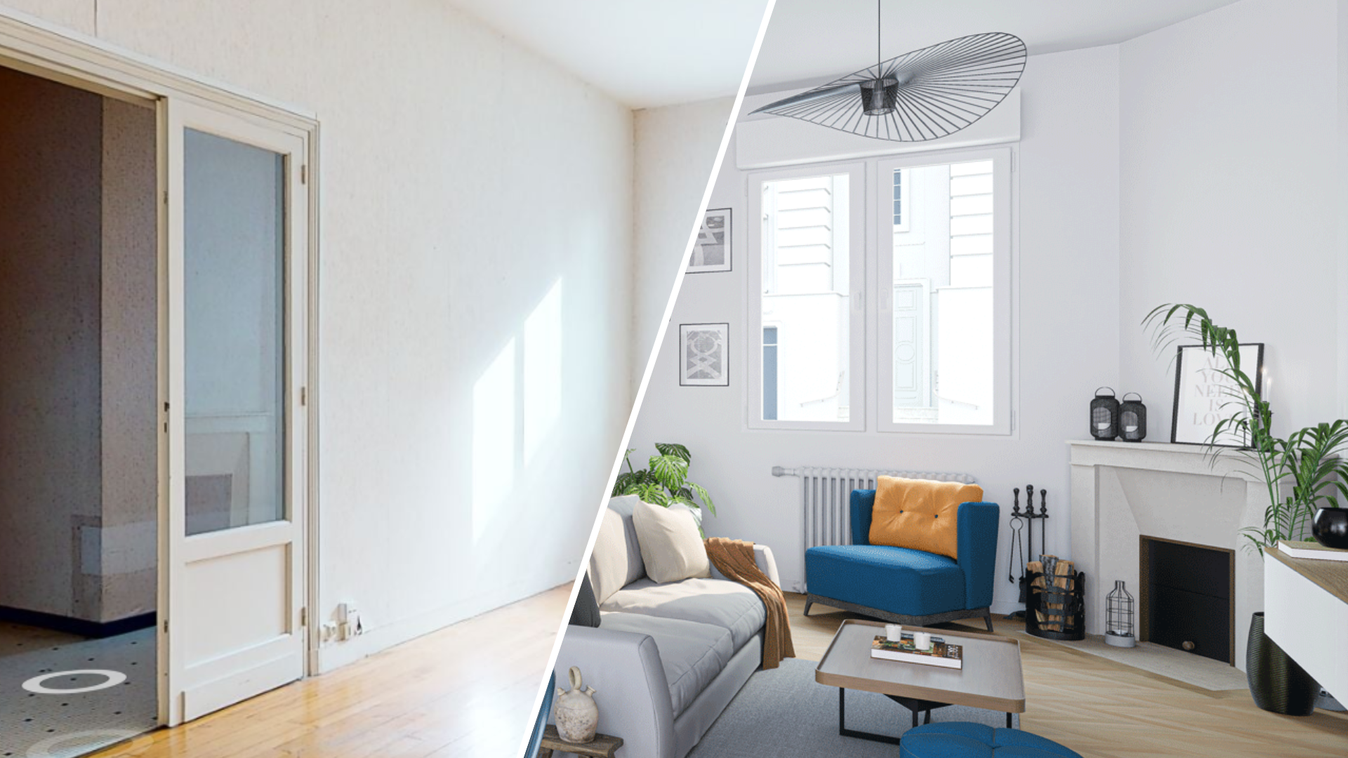 Images avant/après : l’aménagement 3D, de cet espace vide, en une pièce de vie design et accueillante valorise le lieu pour créer un coup de cœur.