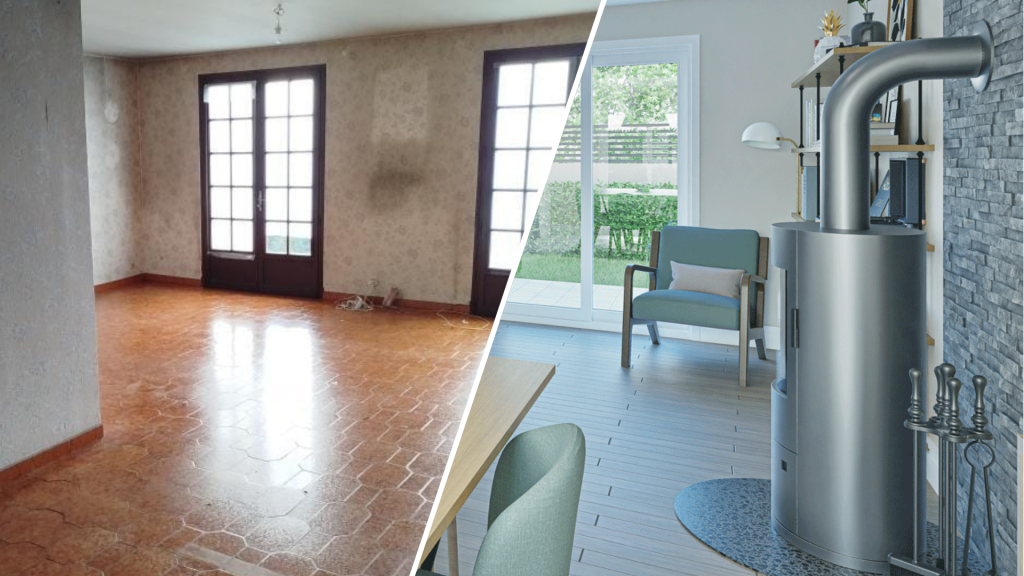 Grâce à la visualisation 3D, l’intérieur sombre et daté de cette maison prend vie pour devenir un séjour lumineux et convivial, parfaitement mis en valeur.