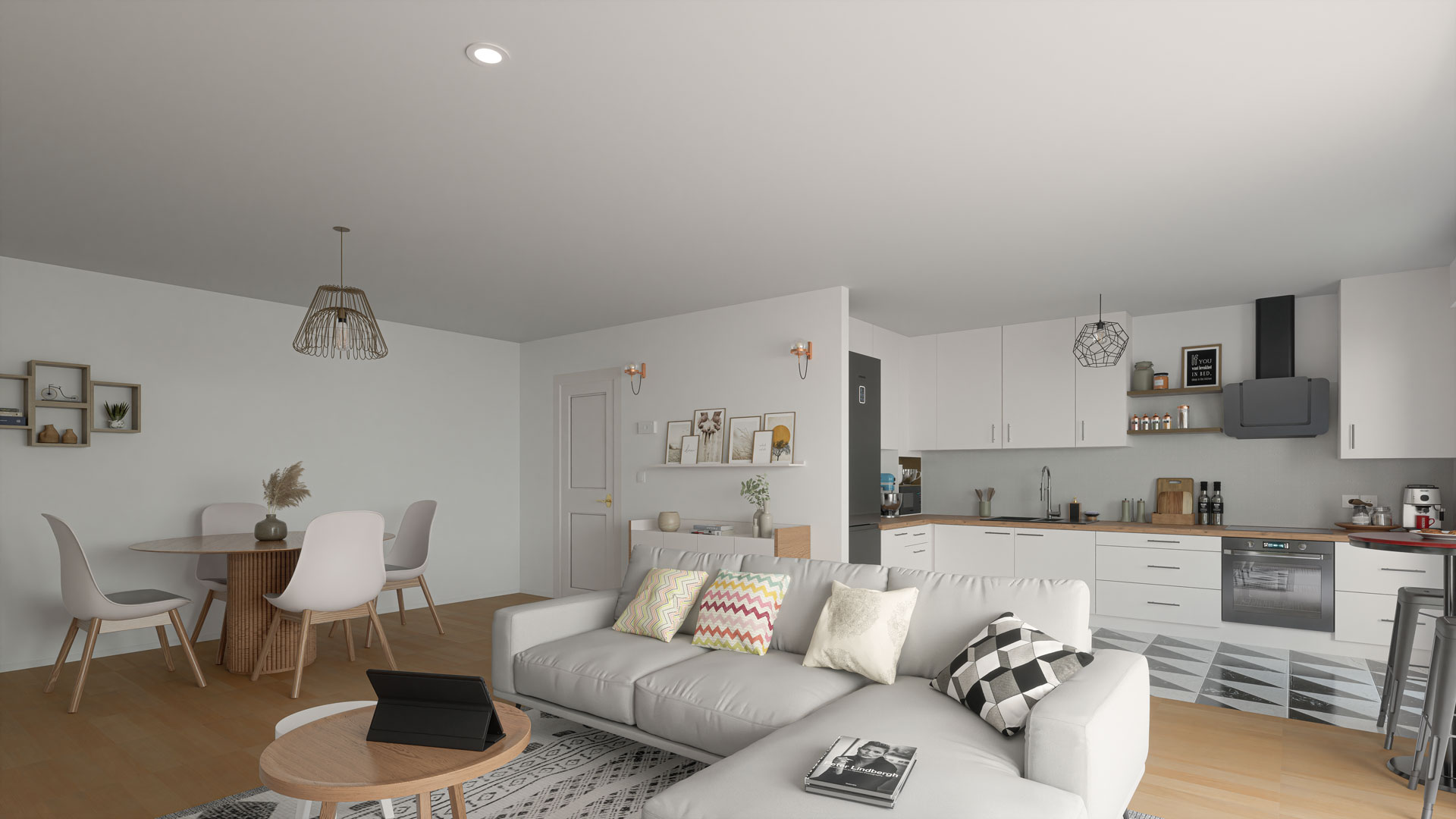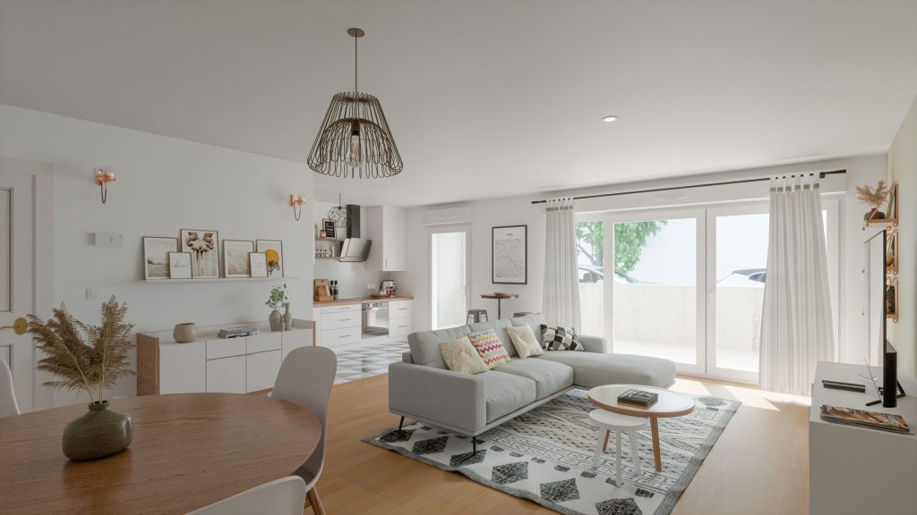 La 3D permet de se projeter immédiatement dans une cuisine fonctionnelle ouverte sur un séjour moderne. Nous faisons disparaitre les contraintes d’origine pour offrir aux acheteurs une projection claire et séduisante.