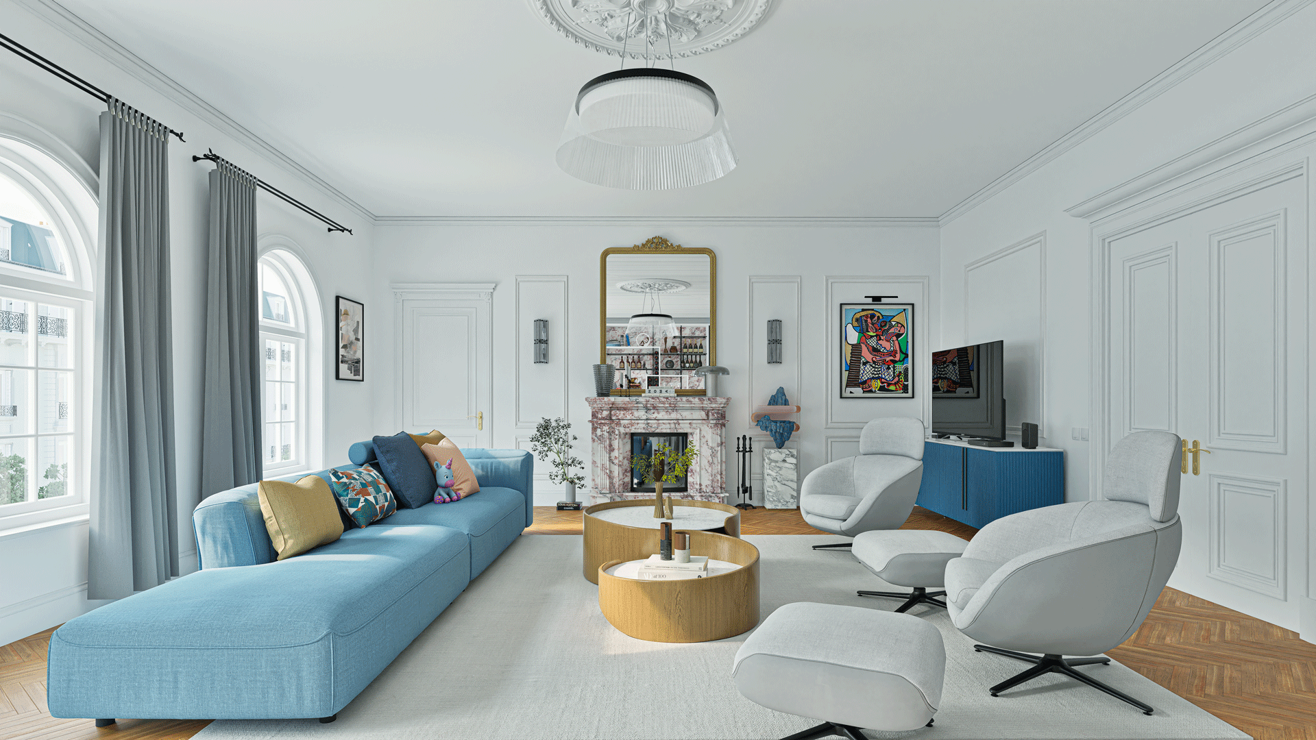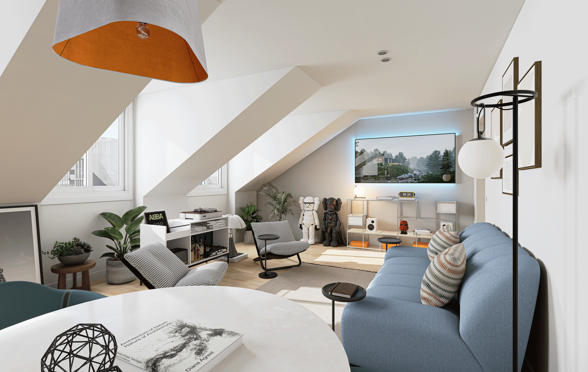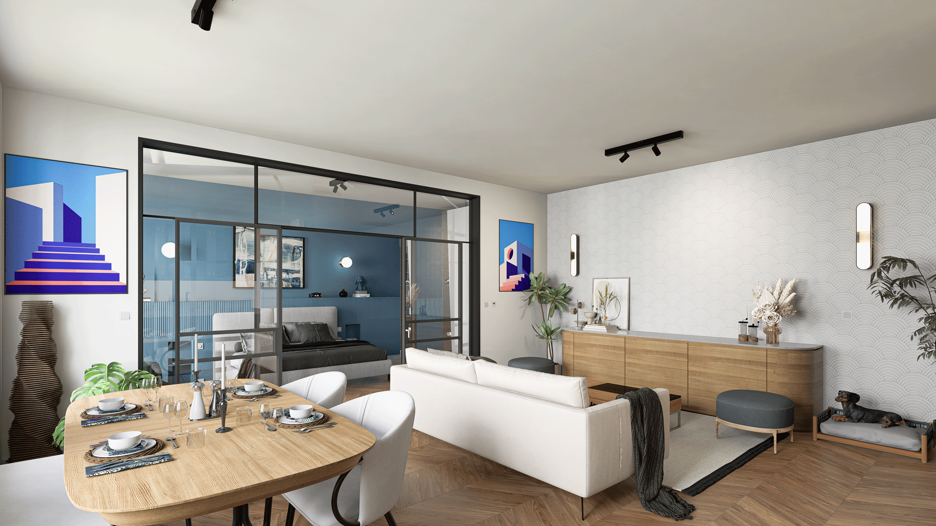 Pour vous proposer un rendu graphique esthétique et réaliste, nous aménageons à partir de mobilier disponible dans des bibliothèques 3D ou modélisé sur-mesure. Afin de suggérer un agencement chaleureux, confortable et fonctionnel, nous sommes attentifs au choix des matériaux, des couleurs, de la décoration et aux jeux de lumières.